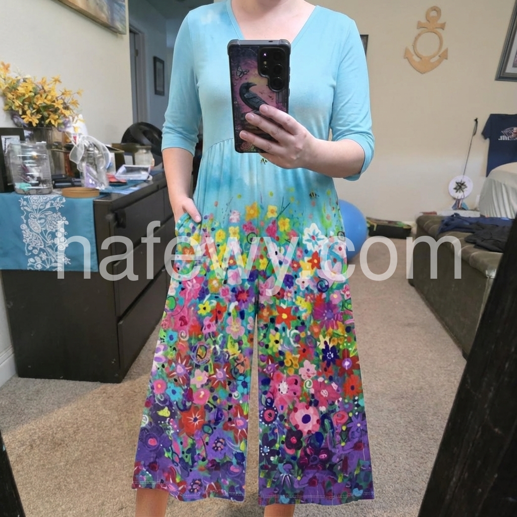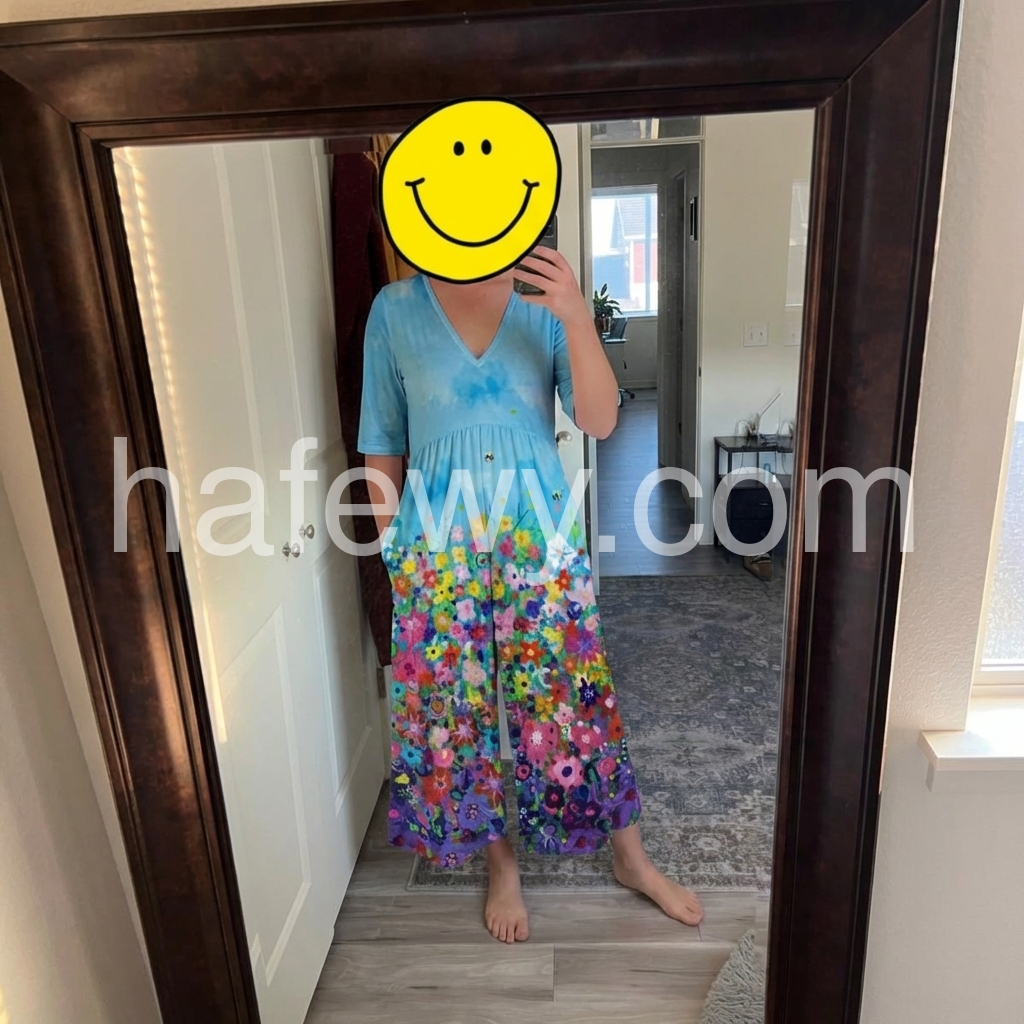 This V-neck short-sleeve jumpsuit features a sky blue top with a colorful floral gradient. The wide-leg design adds comfort and flair. Perfect for summer days or casual outings. Lightweight fabric ideal for warm weather. Pair with sandals for effortless style.