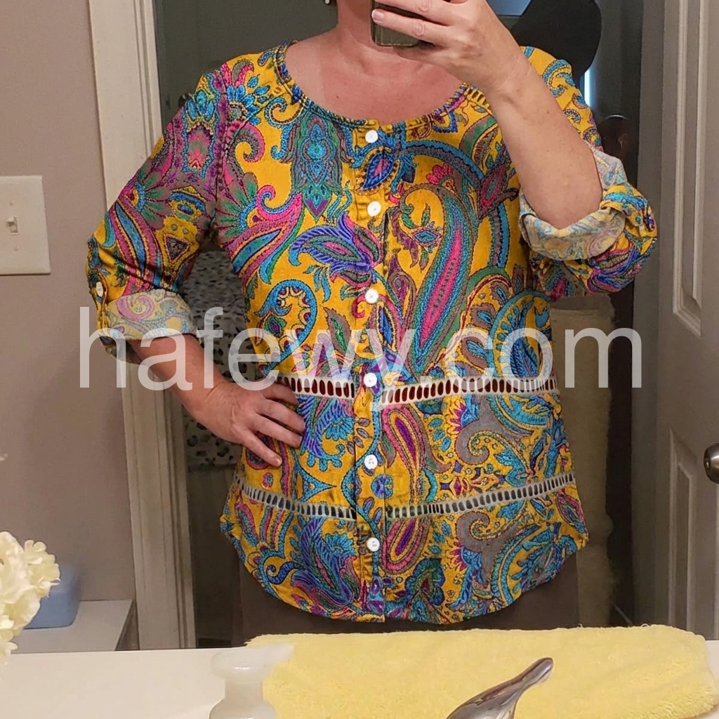 This long-sleeve tunic features a rich yellow base with colorful paisley patterns. The front button design adds vintage charm. Relaxed fit and rolled sleeves for comfort. Perfect for casual wear or bohemian styles. Pair with jeans or leggings for effortless flair.