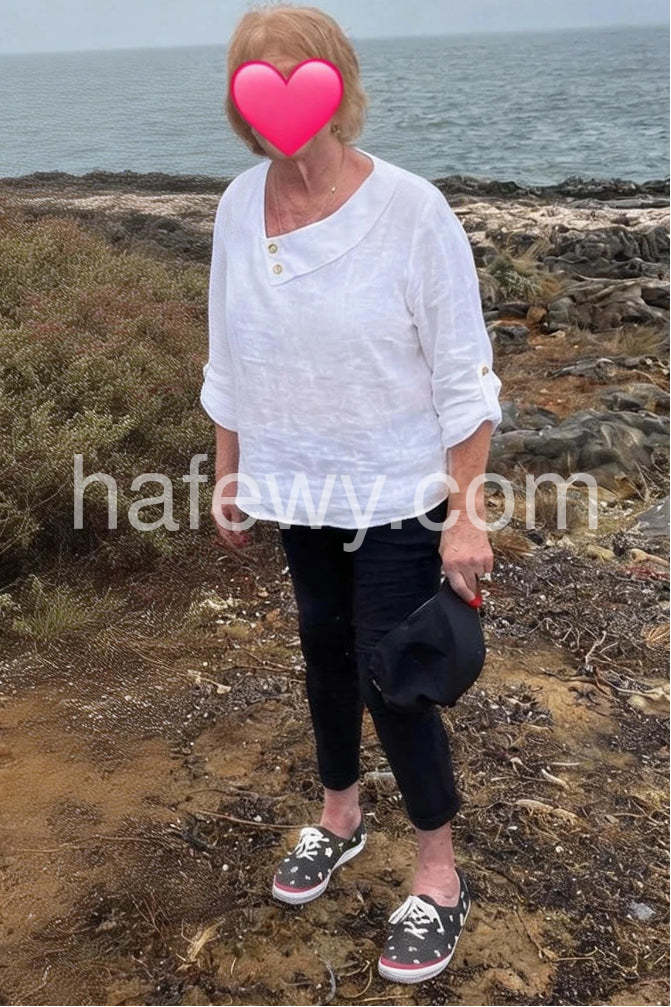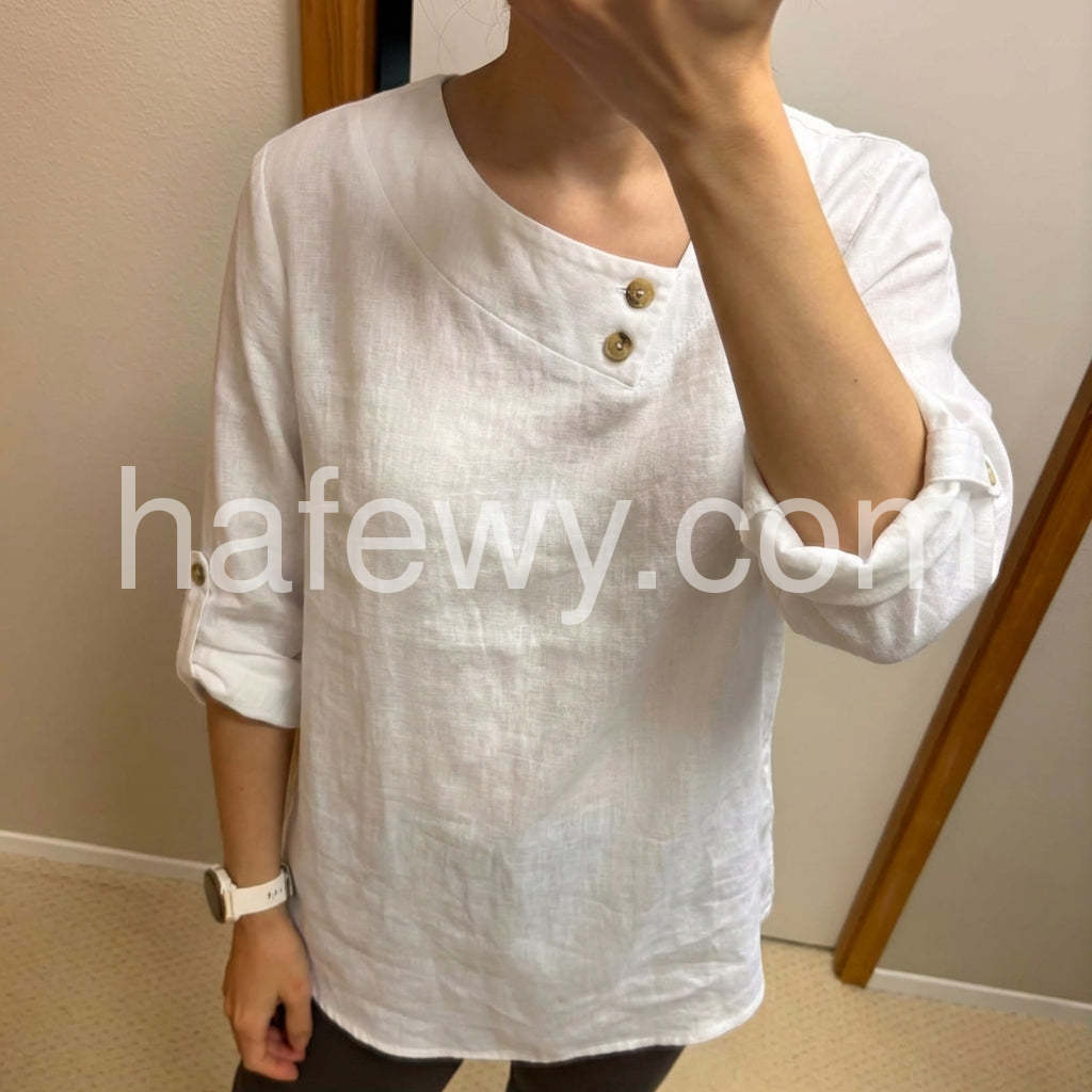 Elevate your everyday style with this Minimalist White Button-Trimmed Blouse, a clean and sophisticated piece that blends simplicity with subtle detail. Crafted from soft, breathable linen-like fabric, this long-sleeve top features an elegant asymmetrical collar that drapes gracefully over the chest, secured with two delicate gold-tone buttons for a touch of understated luxury. The sleeves are finished with matching button cuffs, allowing you to roll them up for a relaxed look or keep them down for a polished silhouette. Designed with a relaxed fit and a slightly curved hem, it pairs beautifully with jeans, high-waisted pants, or skirts—perfect for casual outings, brunch dates, or office wear. Inspired by the curated, minimalist-chic styles found on Lulus.com, this blouse brings effortless elegance to any outfit. Whether dressed up with heels or worn casually with sneakers, it’s a versatile wardrobe staple that celebrates timeless design and comfort. A must-have for women who love clean lines, neutral tones, and refined details.