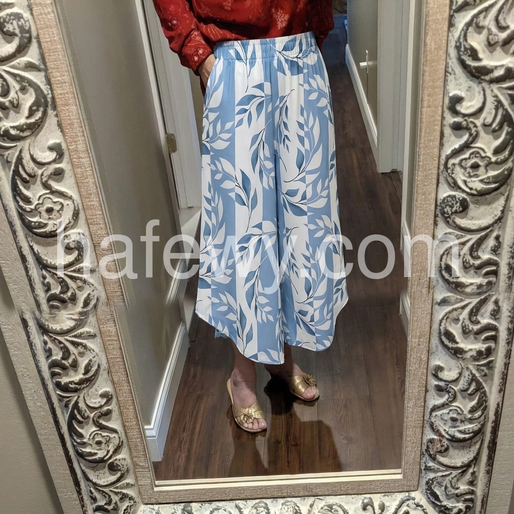 These flowy culottes feature a soft blue and white leaf pattern with a relaxed fit. Elastic waistband for comfort and ease of wear. Wide-leg design with a slightly asymmetrical hem. Lightweight fabric perfect for warm weather. Ideal for beach outings or casual summer days.