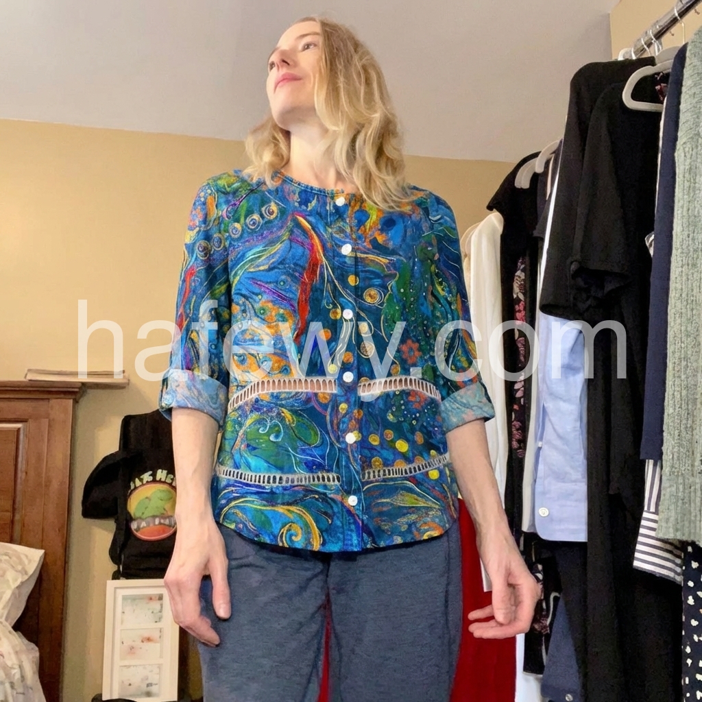 This long-sleeve button-up top features a bold blue base with colorful abstract patterns. The relaxed fit and rolled sleeves add comfort and style. Perfect for casual wear or bohemian outfits. Pair with jeans or leggings for effortless flair. Lightweight fabric ideal for warm days.