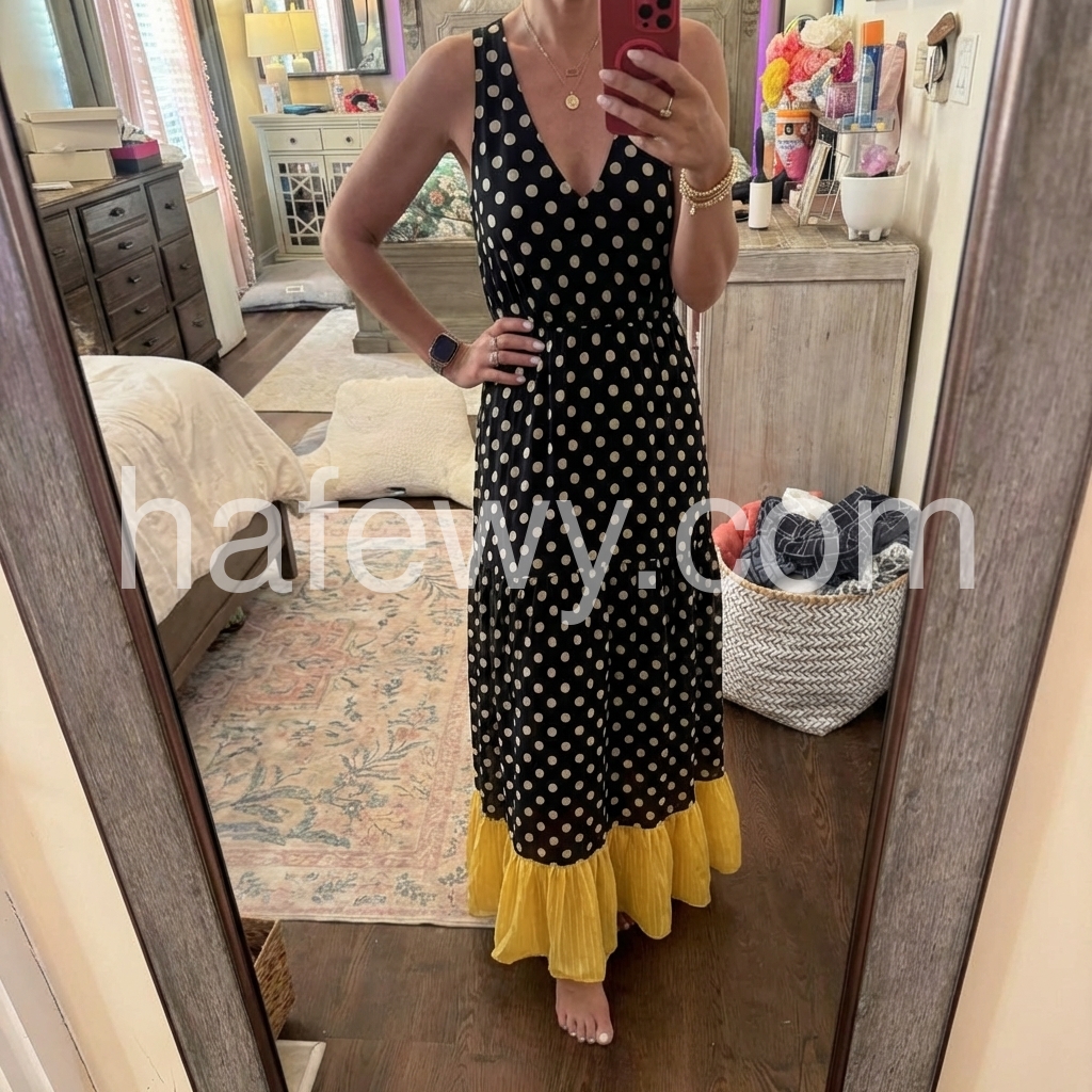 This boho maxi dress is chef’s kiss for summer! The black and gold polka dots are so chic, and that yellow ruffle hem? Chef’s kiss.