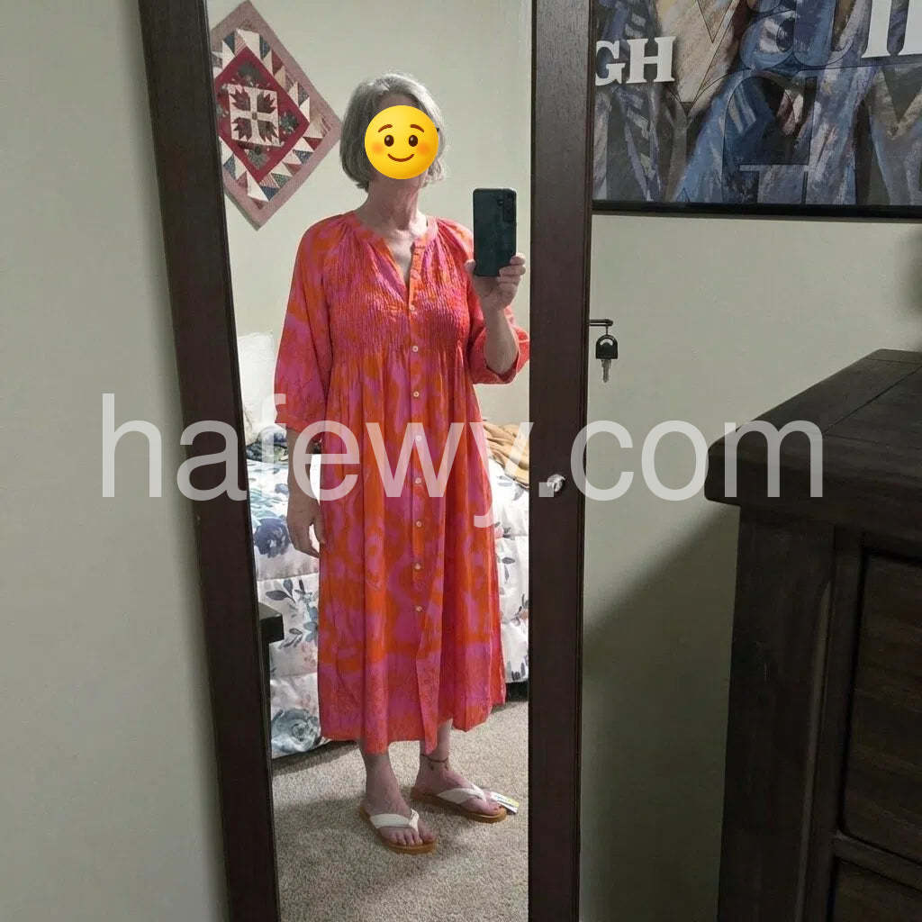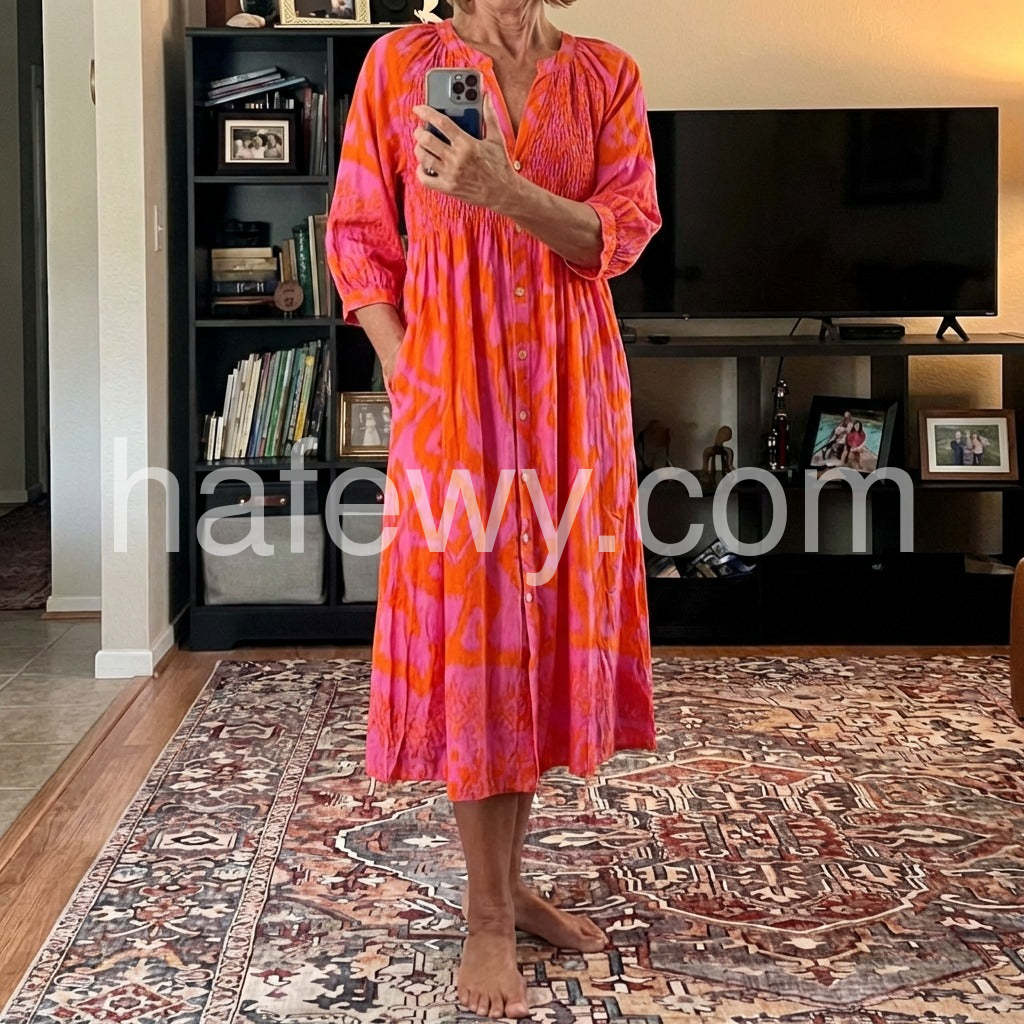 This super-glam hot pink and orange print midi dress is all you need to make a style impression, featuring a round v-neck collar, buttons down the front, and a shirred flattering top. Three-quarter length sleeves provide coverage and versatility to this everyday sophisticated blouse dress. Machine wash cold tumble dry low to medium heat. Iron if needed or lay flat to dry.