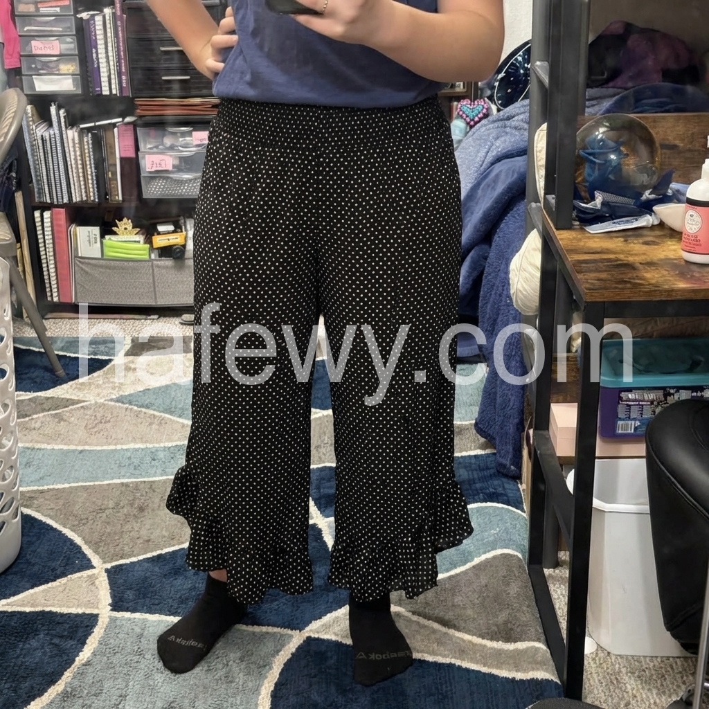 These high-waisted culottes feature a black base with tiny white polka dots. Wide-leg design with ruffled hem for a soft, flared look. Lightweight fabric perfect for warm weather. Ideal for casual outings or relaxed styles. Comfortable and effortlessly chic.