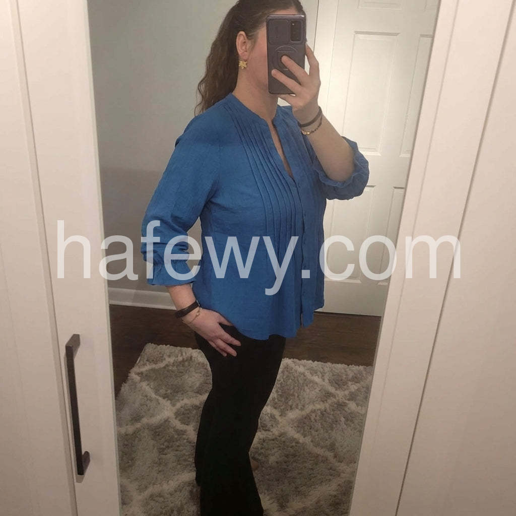 Discover timeless sophistication in this Deep Blue Pleated Button Down Blouse, a beautifully designed top that combines comfort, structure, and feminine flair. Crafted from lightweight, breathable fabric—likely a cotton or linen blend—this long-sleeve blouse features a rich sapphire blue hue that exudes confidence and style. The front is adorned with vertical pleats that add dimension and elegance, while the deep V-neckline offers a flattering touch of allure. A row of matching buttons runs down the center, enhancing the clean, tailored look. The sleeves are finished with gathered cuffs that create a soft ruffle effect when rolled up, adding subtle charm to the silhouette. The peplum hem gently flares out, creating a balanced, hourglass-inspired shape that pairs perfectly with high-waisted pants, skirts, or jeans. Ideal for casual outings, office wear, or weekend brunches, this blouse effortlessly transitions from day to night. Inspired by the curated, minimalist-chic styles found on Lulus.com, it’s a versatile wardrobe essential that brings effortless elegance to any ensemble. A must-have for those who love refined details and classic fashion with a modern twist.