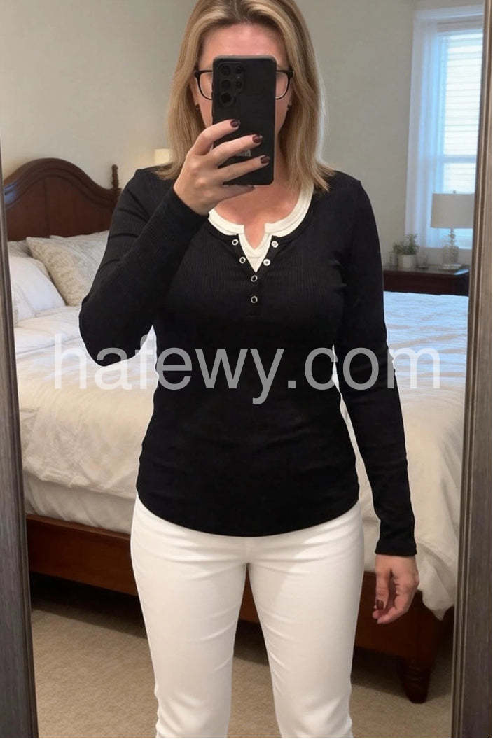 This expertly designed long sleeve top combines classic sophistication with modern versatility. The black foundation is enhanced by crisp white trim framing the collar and hem, creating a refined two-tone aesthetic that commands attention. The structured neckline and tailored silhouette project confidence and professionalism, making it an indispensable piece for contemporary wardrobes. Whether styled with formal separates or casual basics, this top delivers polished results. The quality construction ensures durability and lasting appeal, while the timeless color blocking transcends seasonal trends. An investment piece that anchors any collection with understated luxury.
